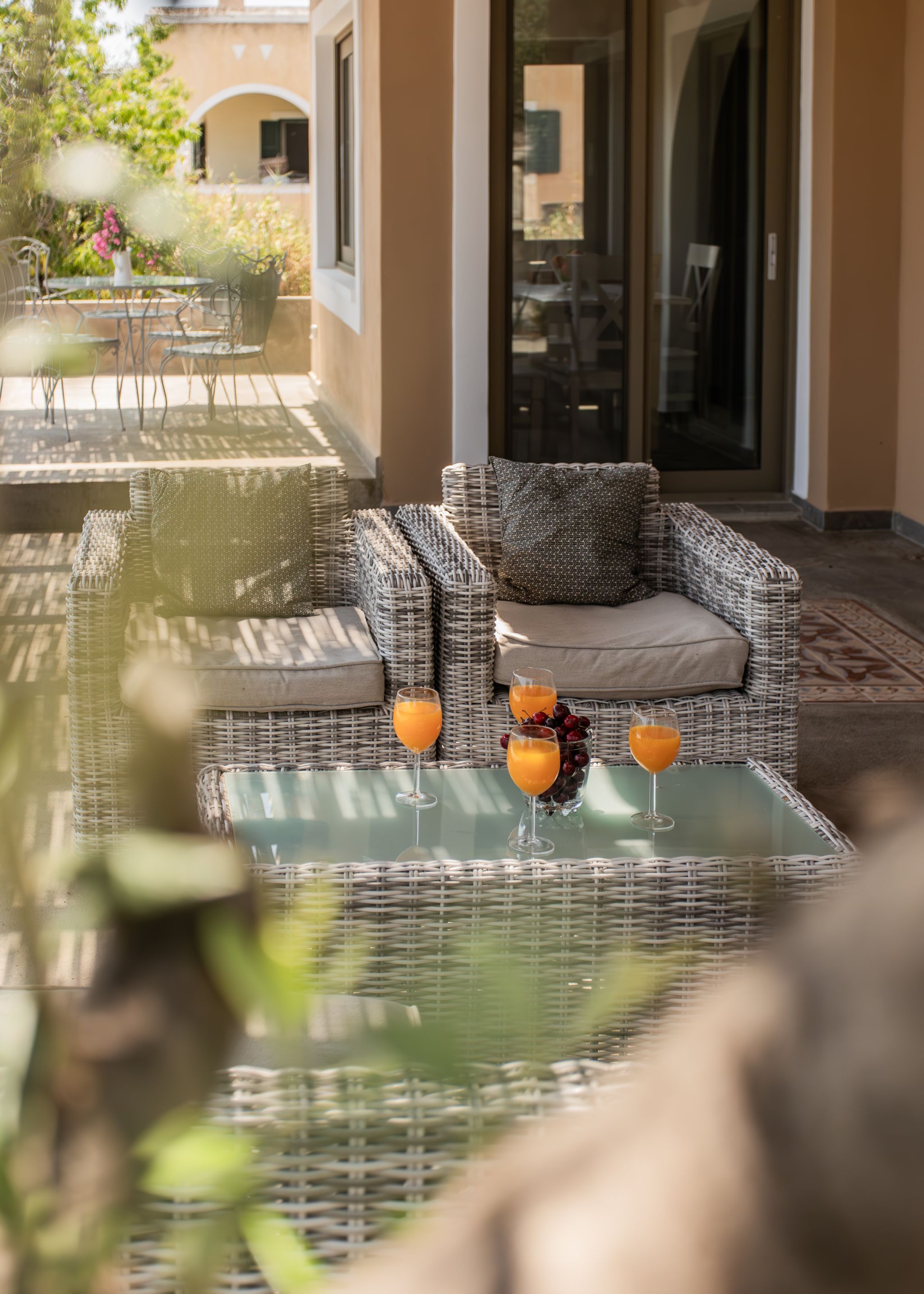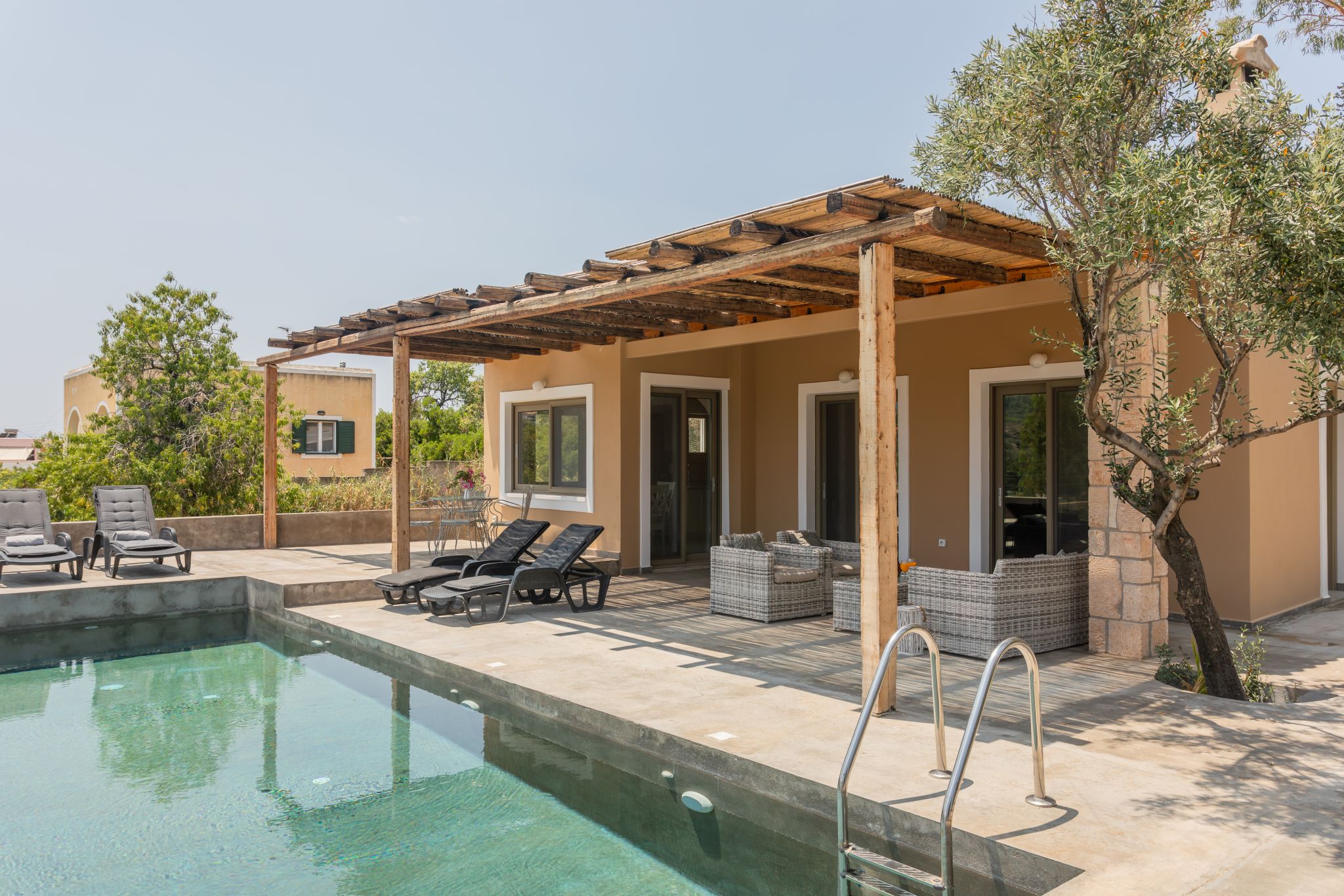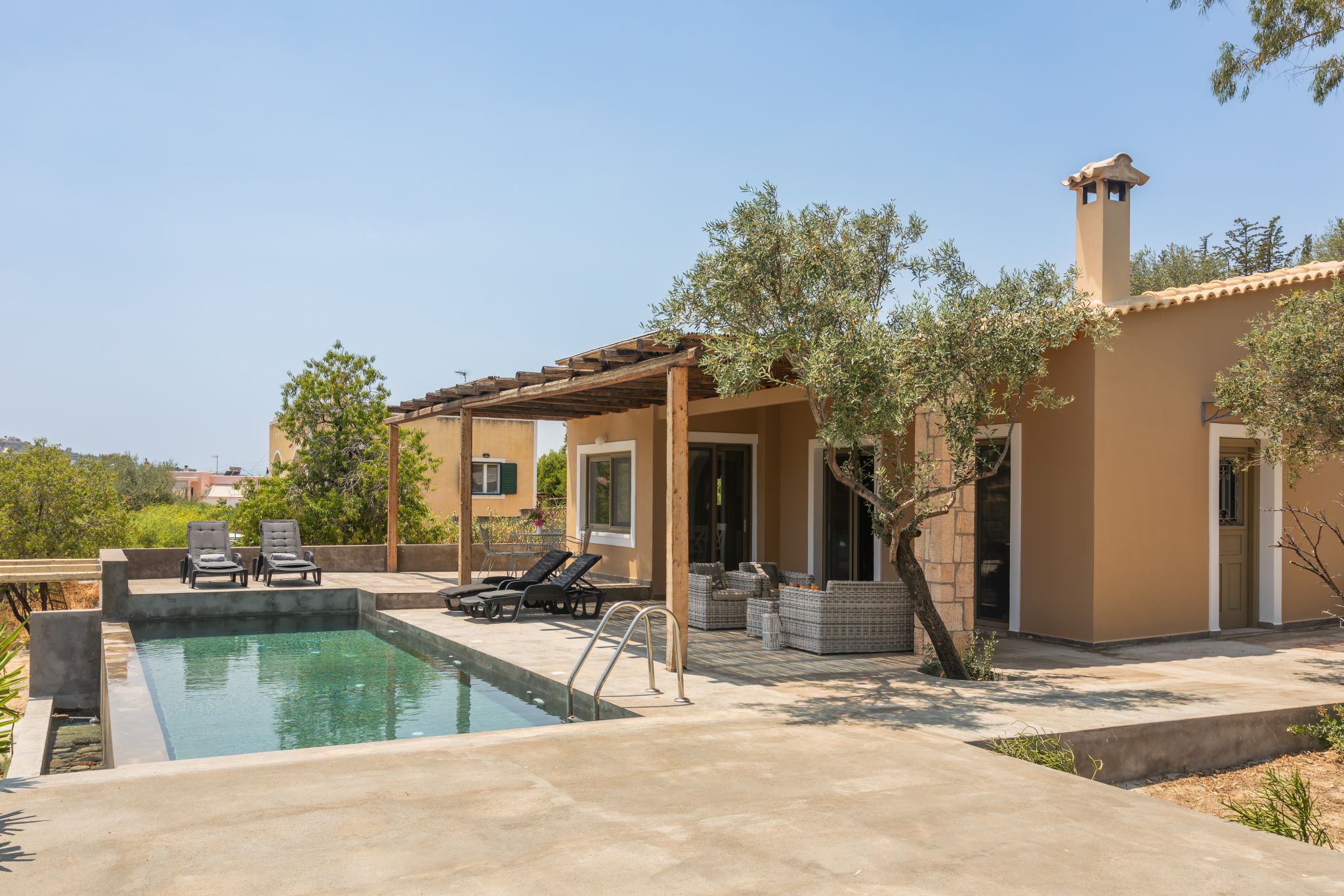 There is a large living room, a fully equipped kitchen, a double bedroom, a twin bedroom (2 single beds), one bathroom and one WC. The living room opens onto the furnished outdoor seating area under the pergola and the private pool area, a few meters away.